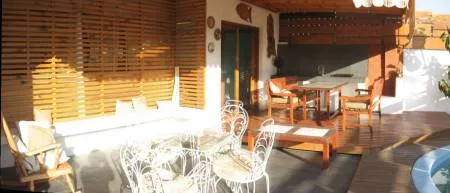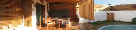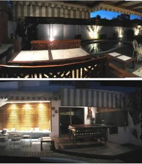 | El encargo fue el diseño y construcción de una terraza que vinculara la vivienda con el jardín. Se decidió abrir el muro del costado inferior derecho, para integrar el programa del interior de la vivienda con el patio, un toldo cubre el lugar de descanso y para realizar los asados. Se construye un borde de entablado de madera que enmarca la piscina. |