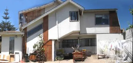 A través de una celosia se cubren los ventanales que dan hacia el jardín, lo que conserva la intimidad de las habitaciones interiores pero permite el paso de la luz. Se diseña un asiento, como borde elevado para el descanso que además sirve para guardar la leña que se utilizara durante el invierno. Se le instalan luminarias por debajo que durante el verano iluminan este banco de hormigón, dando una condicion de estar suspendido. |
